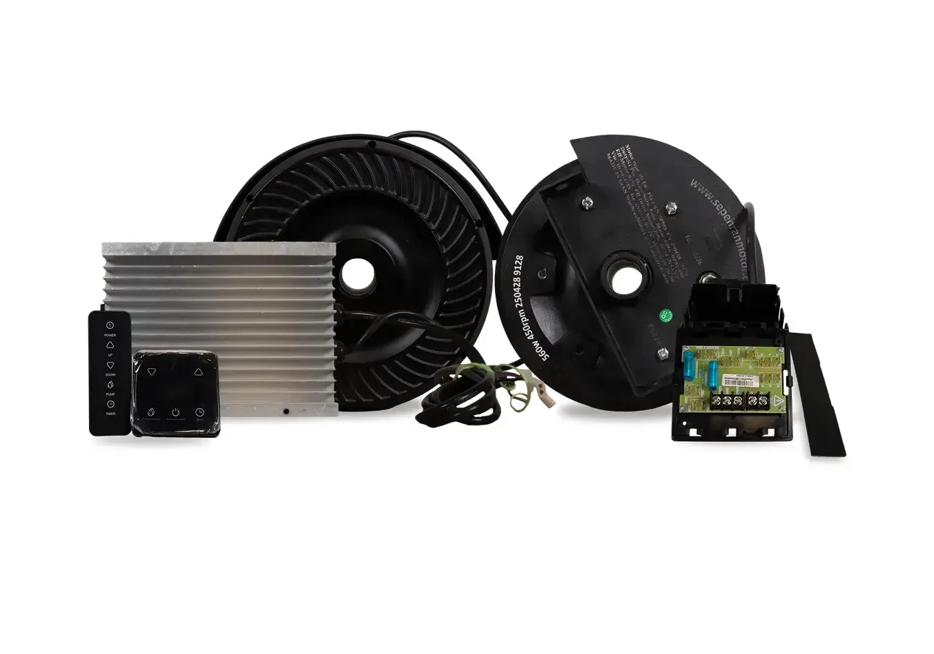 کیت الکتروموتور BLDC کولر آبی سپهران شامل الکتروموتور، درایو، پنل لمسی هوشمند، جعبه تقسیم و یک کنترل از راه دور RF است.